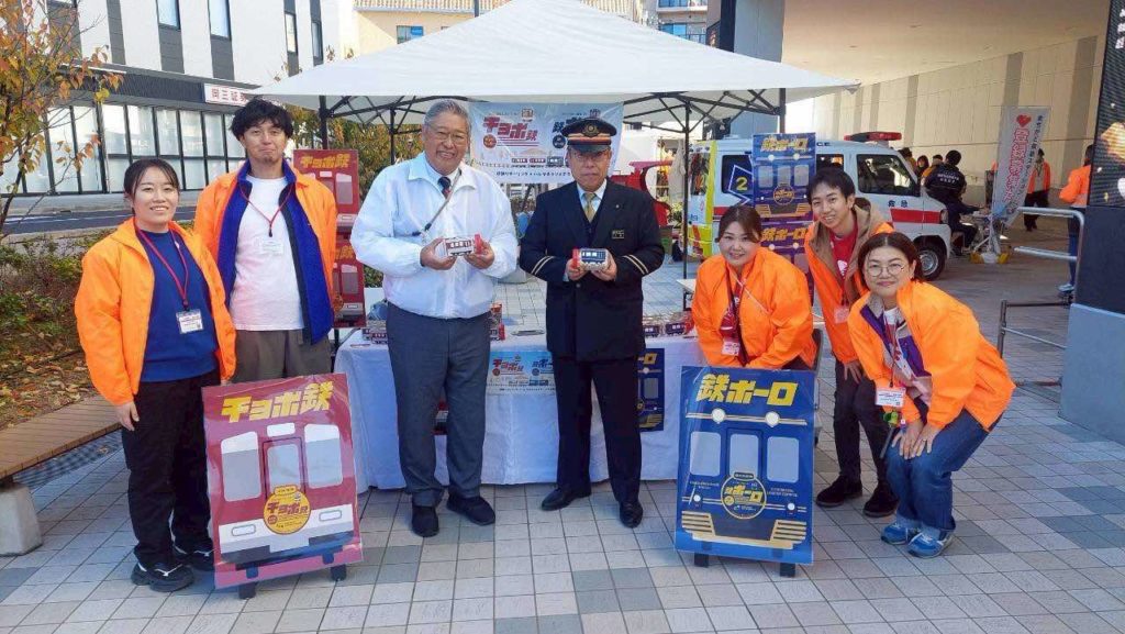 当日は藤井寺市長と、別企画で参加されていた藤井寺駅長がブースにお越しくださり、「鉄ボーロ」と「チョボ鉄」を手に取ってスタッフと一緒に記念撮影も。