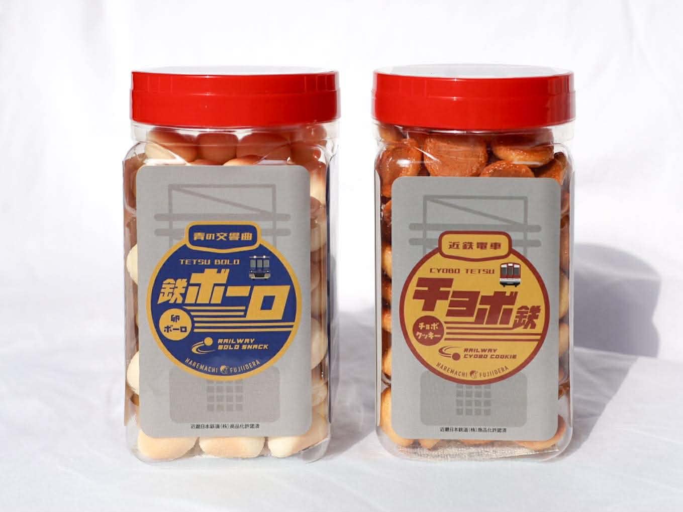 乳ボーロならぬ「鉄ボーロ」は近鉄南大阪線を走る観光特急「青の交響曲」、チョボチョボクッキーならぬ「チョボ鉄」はおなじみの近鉄マルーンカラーでの展開です。